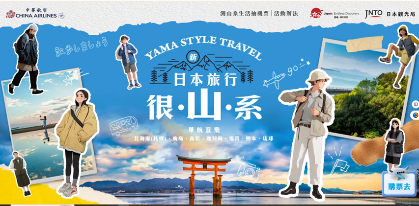 日本的札幌、福岡、熊本、鹿兒島、香川、廣島、琉球,以大自然的美景為主的二線城市,結合日本近年流行的「Yama Style」,從線上互動小遊戲讓消費者測出與自己最合拍的山系穿搭及旅行城市…